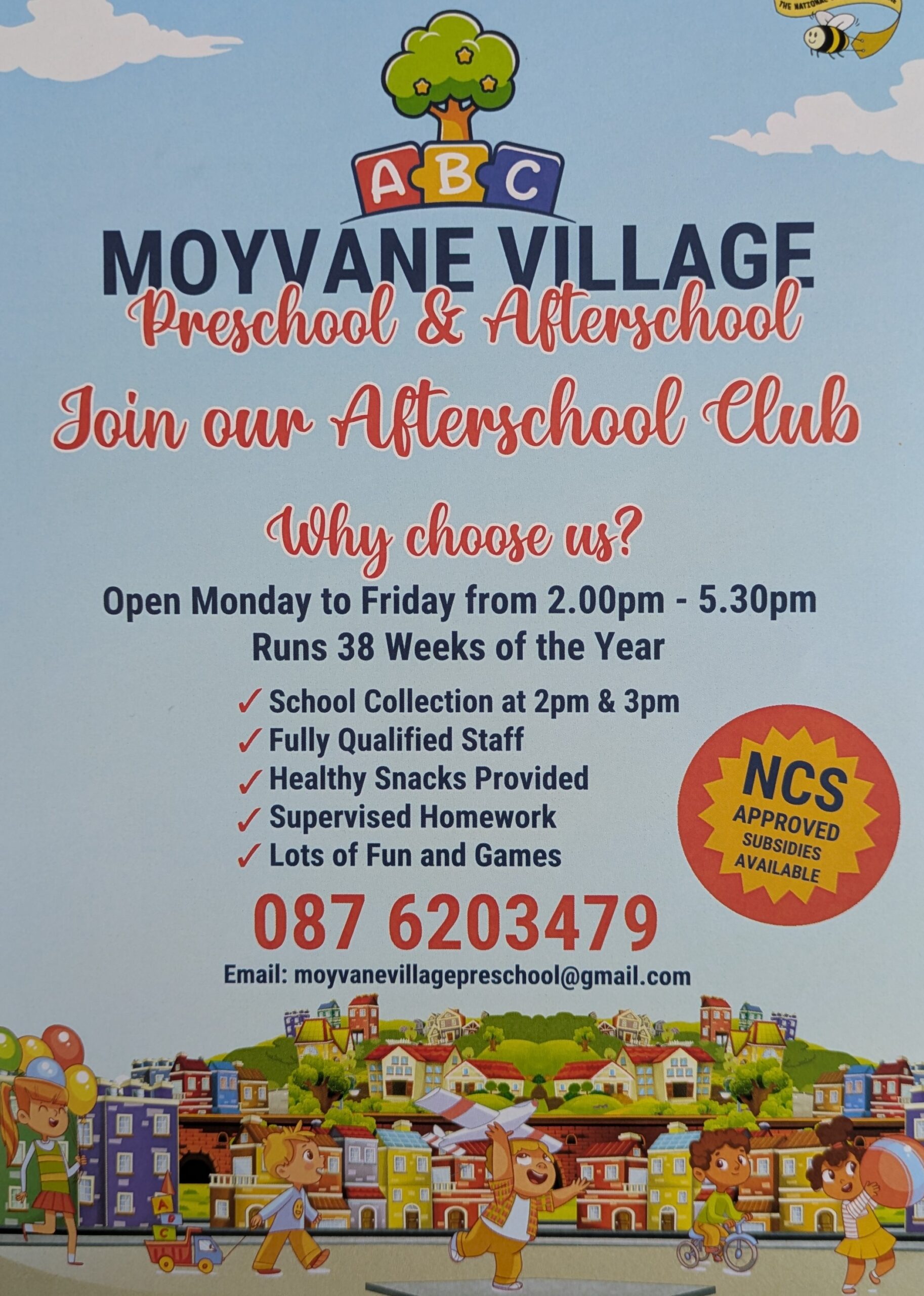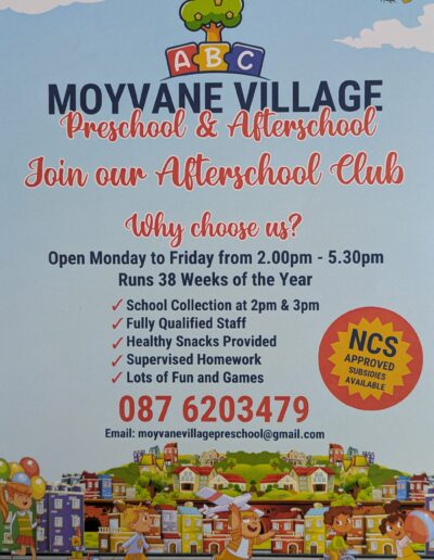 For more information contact Anna Marie Flaherty on (087) 620 3479 or email moyvanevillagepreschool@gmail.com or view the Facebook page: